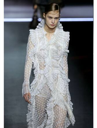 Ruches, volant, gorgiere elisabettiane, pizzi e ricami. I look in passerella sono molto ricchi e richiamano a momenti della storia e del costume inglese ben riconoscibili. Nessuna ispirazione prevale, però, in una collezione che mescola tutto con spirito rock e contemporaneo
