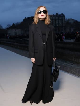 Total black e stile sartoriale anche per Isabelle Huppert, rigorosa coi pantaloni ampi e il blazer. La diva del cinema francese è global ambassador della Maison del lusso dall'estate del 2023