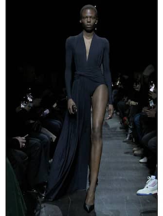 La sfilata di Balenciaga è svolta a Parigi alla Cour du Dome des Invalides, location trasformata da una passerella labirintica e oscura caratterizzata da drappi neri. Gli ospiti vip del fashion show hanno posato lì in total look del brand.