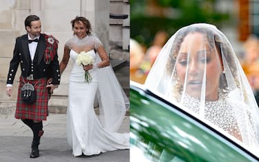 La trentaduenne, che ha indossato l'abito bianco e il velo, non ha rinunciato al suo stile e ha scelto una creazione con la gonna lunga fino al ginocchio e scollata firmata Vivienne Westwood. Al look ha aggiunto gli occhiali da sole scuri con la montatura avvolgente, suo marchio di fabbrica.