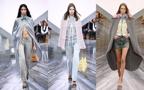 Tra papillon inglobati nelle camicie, redingote che fondono il maschile e il femminile (altro tratto in comune della visione di Anderson con quella di Dior), la mantella si impone come capo "mai senza" di questa collezione, da abbinare ai pantaloni o alla minigonna in denim