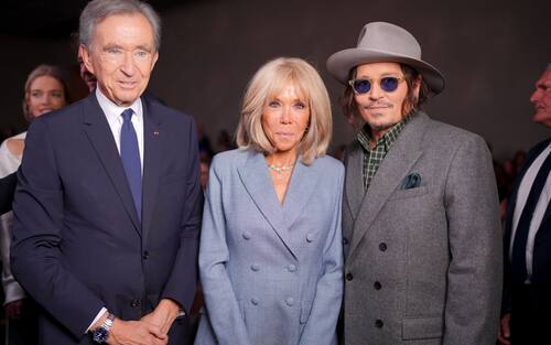 Un trio inedito posa nella prima fila di Dior: Bernard Arnault, fondatore e CEO di LVMH, la Première Dame Brigitte Macron, frequente indossatrice di Dior, e Johnny Depp, volto storico di Dior Beauty nonché uomo simbolo della fragranza Sauvage