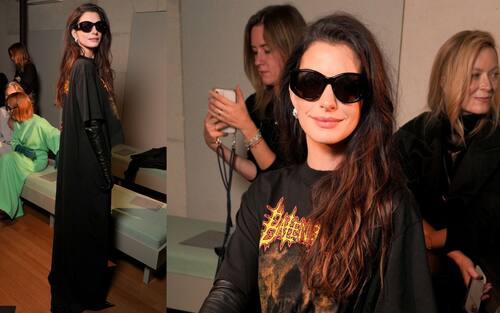 Anne Hathaway, amica di Piccioli e grande interprete delle sue precedenti collezioni, ha seguito dalla prima fila il debutto dello stilista italiano a Parigi dimostrando una grande affinità con lo streetwear di Balenciaga. Per la star premio Oscar chioma mossa e look dallo spirito rock con guanti lunghi di pelle e shirt dress con loghi fiammeggianti in stile heavy metal chic
