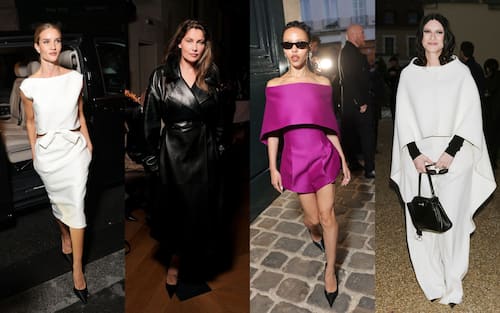 Look monocromi, molti dei quali total black o total white con accessori a contrasto. Ad applaudire Piccioli dalla prima fila ci sono anche Rosie Huntington-Whiteley, Laetitia Casta, FKA Twigs e Laura Pausini