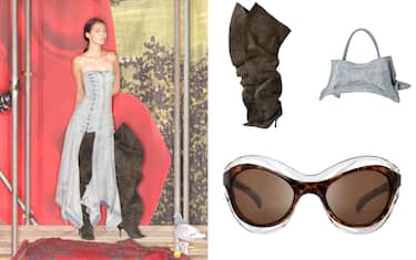 Uno dei look più rappresentativi della collezione, composto da abito in denim washed senza spalline e caratterizzato da gonna svasata con gli spacchi profondi e asimmetrie e stivali col tacco maxi, ampi sulla coscia. Tutta l'estetica di Glenn Martens punta sulle silhouette e i volumi inaspettatti.