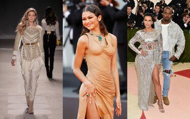 Il Met Gala è sempre stato una grande vetrina per Balmain, del resto, le creazioni di Rousteing, sofisticate e lavorate come opere d'arte, sembravano fatte proprio per stare sotto i flash dell'evento moda più prestigioso di tutti. Da sinistra, un abito fatto di metri da sarta di metallo per Jenna Ortega (2025), un look con la giacca lavorata per Justin Bieber (2015) e un abito efetto cristallo con dettagli scultorei per Elle Fanning per il Met Gala 2023