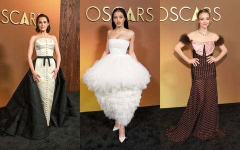 Tra glamour Old Hollywood e guizzi contemporanei. Da sinistra: Zoey Deutch con abito in stile vintage che rievoca gli anni del suo Nouvelle Vague, Chase Infiniti col dress con la gonna di tulle di Louis Vuitton ed Amanda Seyfried con l'abito a pois coi dettagli di pelliccia di Valentino