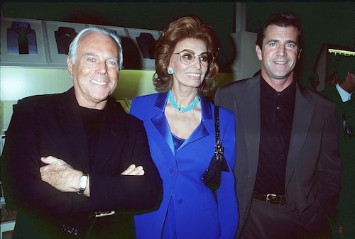 Armani ha realizzato, inoltre, gli abiti indossati da Christian Bale nel secondo e terzo capitolo della saga de Il cavaliere oscuro di Christopher Nolan. Nella foto Giorgio Armani con Sofia Loren e Mel Gibson