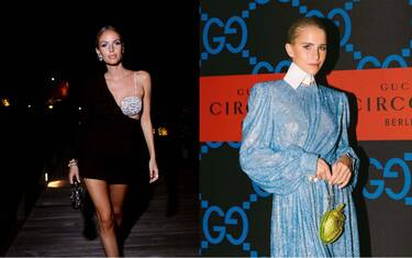 Caroline Daur indossa un lungo abito scintillante abbinato ad una clutch by Gucci