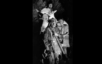 Vittorio Gassman, Lino Toffolo e Paolo Villaggio durante le riprese di 'Brancaleone'