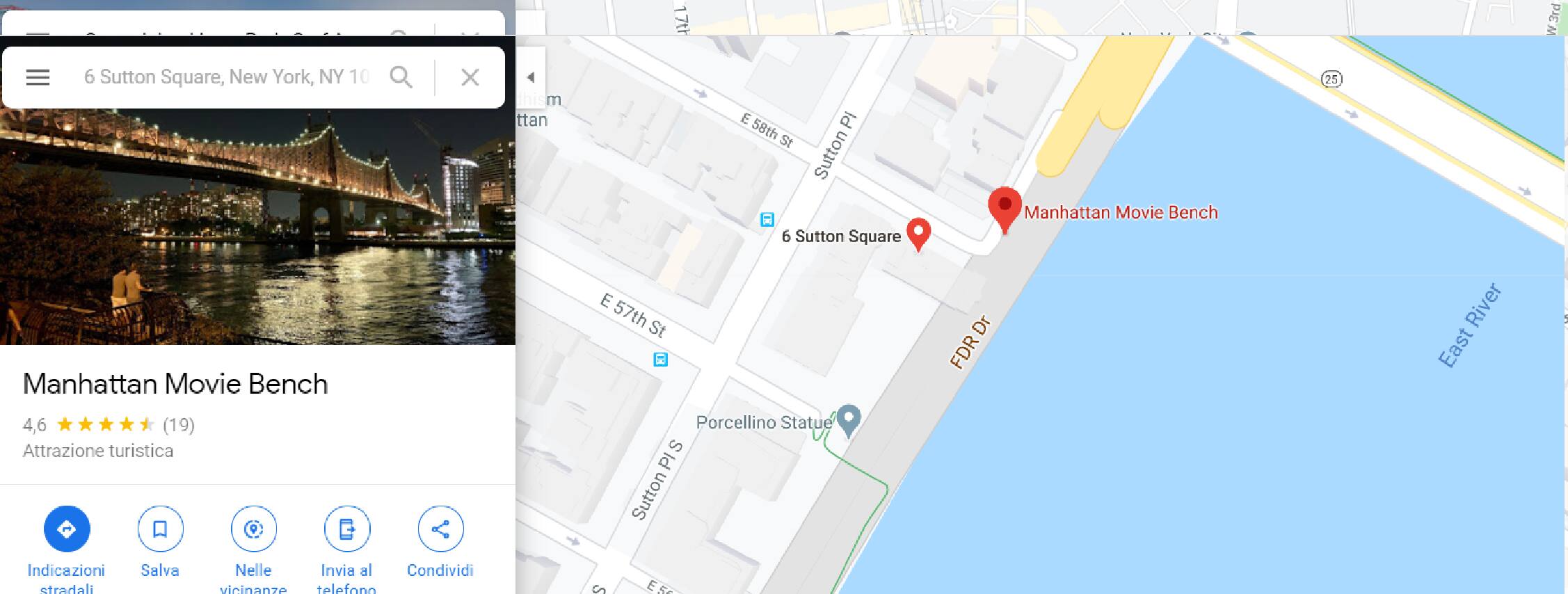 Uno dei migliori film di Woody Allen, capace di scaldare il cuore di molti spettatori non solo per le vicende narrate o le emozioni vissute dai protagonisti, ma anche per l’incantevole e favolistica ambientazione. Una New York più magica e al tempo stesso ruvida sarà impossibile ritrovarla sul grande schermo. Girato con formato panoramico e un bianco e nero di rara potenza estetica (merito del compianto direttore della fotografia Gordon Willis), Manhattan è un concentrato di idee, intuizioni, geometrie e immagini che difficilmente verranno dimenticate. Sicuramente, la più iconica tra queste è presente sul poster del film: le sagome dei due protagonisti seduti su una panchina intenti a mirare la bellezza di uno dei tanti ponti della metropoli. Si tratta del Queensboro Bridge e per scattare una fotografia nel punto esatto delle riprese dovrete recarvi sulla 58th Street tra Sutton Square e Sutton Place. Attenzione però, la panchina non è mai esistita, è stata posizionata lì appositamente per le riprese e poi spostata nuovamente.