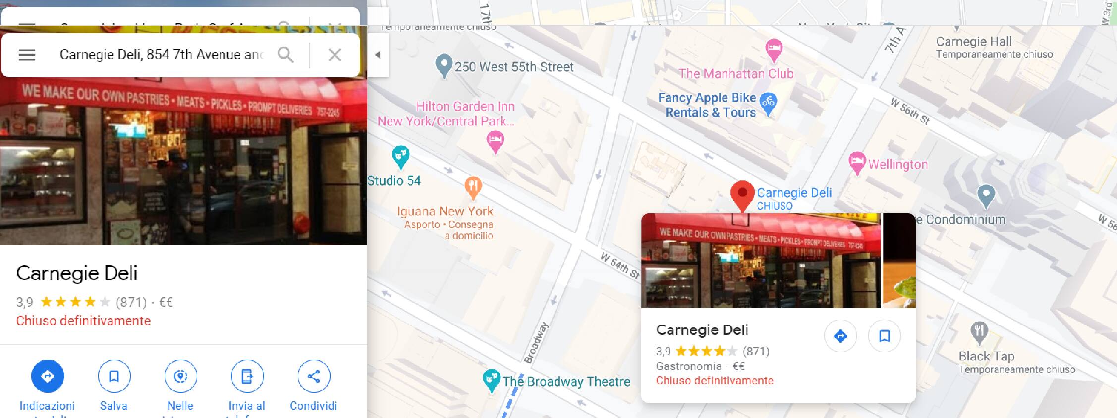 Uno dei film più nascosti e sottovalutati della filmografia di Woody Allen restituisce sin dal titolo tutto l’amore e la passione del regista non solo per la sua città ma per il mondo dello spettacolo in essa racchiuso. Nei panni di un impresario squattrinato e “incompreso”, Allen firma uno dei suoi film più genuini e divertenti posando la cinepresa verso chi, di solito, non viene posto sotto la luce dei riflettori. Gli sconfitti, gli illusi, gli eterni secondi popolano le strade della città che non dorme mai, costretti a rimanere nell’ombra senza poter mai calcare i palcoscenici più prestigiosi. Come dimostra l’ultima inquadratura del film, una lunga carrellata a seguire la corsa di Allen che attraversa una città sporca, asfissiante, inquinata ma dannatamente ipnotica, sino ad arrivare alla sua personale Carnegie Hall, ovvero al ristorante Carnegie Delicatessen di Broadway, conosciuto semplicemente come Carnegie Deli. Lì potrà finalmente riappacificarsi e provare, di nuovo, a intraprendere la via del successo. Il locale, chiuso ormai da qualche anno, si trovava sulla 7th Avenue (tra la 54th e la 55th).
