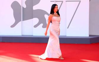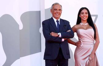Georgina Rodriguez sul red carpet di The Human Voice insieme al direttore della Mostra di Venezia, Alberto Barbera