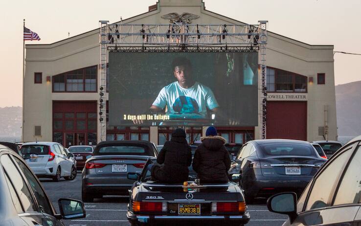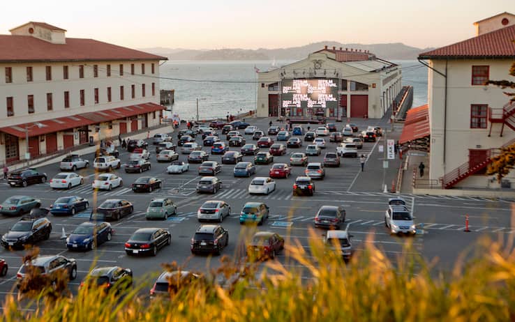 Dici drive-in, pensi (o sogni) California. Anche se il primo “vero” drive-in sorse nel New Jersey, nel 1932, e ci vollero altri 15 mesi prima che l’idea trovasse realizzazione a Los Angeles, la patria del cinema, all’angolo tra Pico e Westwood boulevard. Poi, lenta ma costante, la crescita che portò al boom degli anni ’50 (e in parte ’60): si conta che allora i drive-in tutta America fossero più di 4.000, molti anche negli stati rurali. A quella fece seguito un lento ma costante declino, gli schermi si spensero uno a uno e alla fine degli anni ’80 sembravano soltanto il ricordo di un romantico passato: si contavano non più di 200 drive-in in tutto il nord America. Ma l’immaginario è rimasto, e allora al San Francisco Film Festival (iniziato il 9 aprile, si chiuderà nel weekend) hanno pensato di sfruttare l’infausto momento — con il divieto di accesso alle normali sale, per le necessità di distanziamento e i divieti di assembramento imposti dal Covid — per resuscitare in grande stile il drive-in. Tutti dentro le proprie auto per gustarsi il film, come una vola, forse con più gusto ancora di una volta. Il panorama aiuta, perché il Fort Mason Flix — nell’ex area militare che ha ospitato il porto principale della città durante la Seconda Guerra Mondiale — affaccia sulla Baia, con il Golden Gate sulla sinistra e lo skyline della città alle spalle.