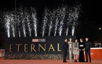 A Roma, in chiusura della Festa del Cinema, arriva Eternals, il terzo film della Fase Quattro dell'Universo Cinematografico Marvel, diretto da Chloé Zhao. E sul red carpet è una parata di star: nel cast infatti figurano Angelina Jolie (nella foto con le figlie Shiloh e Zahara), Brian Tyree Henry, Gemma Chan, Richard Madden, Kumail Nanjiani, Lia McHugh, Lauren Ridloff, Barry Keoghan, Don Lee, Kit Harington e Salma Hayek