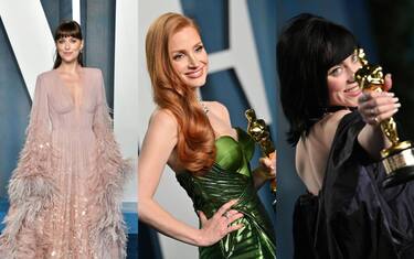 Sempre in tema premiati, Jessica Chastain (Miglior attrice protagonista per Gli occhi di Tammy Faye) ha optato per un abito verde di Gucci.