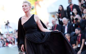 Look monocolore Louis Vuitton e scuro anche per Cate Blanchett che dopo quasi dieci giorni è tornata alla Mostra per seguire le premiazioni. La protagonista di Tár è superba nel suo abito maniche a cappa. Voto 9