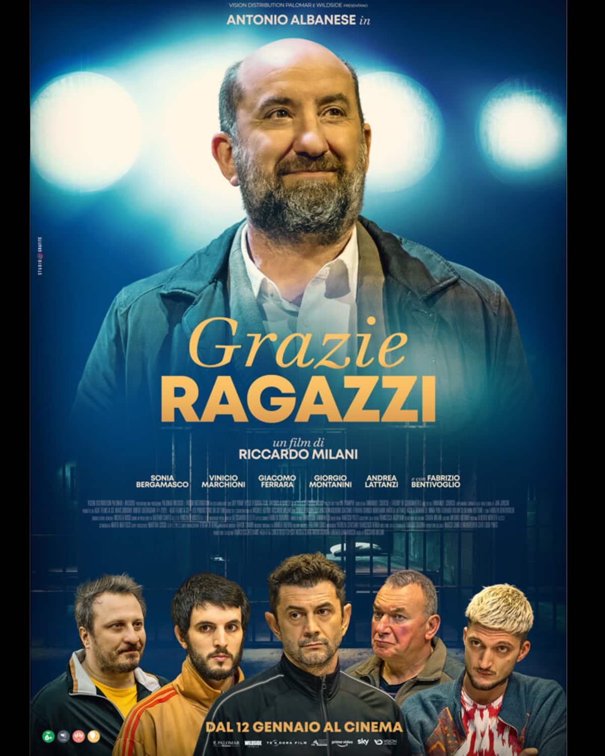 Grazie ragazzi arriva al cinema da giovedì 12 gennaio. Firmata da Riccardo Milani, una commedia tratta da Un triomphe, recente film francese di Emmanuel Courcol, che si ispira liberamente a una vicenda realmente accaduta in Svezia nel 1985. Il protagonista principale è Antonio Albanese, affiancato da Sonia Bergamasco, Vinicio Marchioni, Giacomo Ferrara., Giorgio Montanini, Andrea Lattanzi, Nicola Rignanese, Fabrizio Bentivoglio, Bogdan Iordachioiu.
