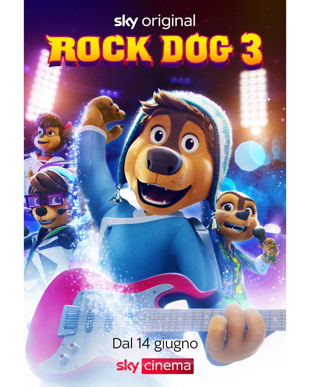 Sono stati diffusi oggi il poster e il trailer di Rock Dog 3, divertente lungometraggio d’animazione targato Sky Original, e terzo capitolo delle avventure del mastino tibetano amante della musica Bodi, personaggio basato sul romanzo grafico cinese Tibetan Rock Dog. Il film sarà in esclusiva da mercoledì 14 giugno su Sky Cinema e in streaming solo su NOW.