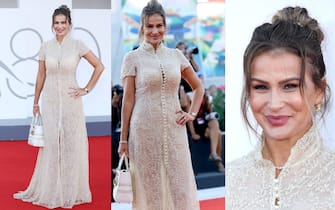 Volteggia Caterina Murino nel suo abito violetto in stile dea. La madrina della Mostra del Cinema 2023 si abbandona a una serie di giravolte che valorizzano il design del suo dress leggero plissé. Lo styling che prevede sandali in tinta, una parure di diamanti bianchi e un'acconciatura con ponytail alta è di Marvi De Angelis. Voto: 9