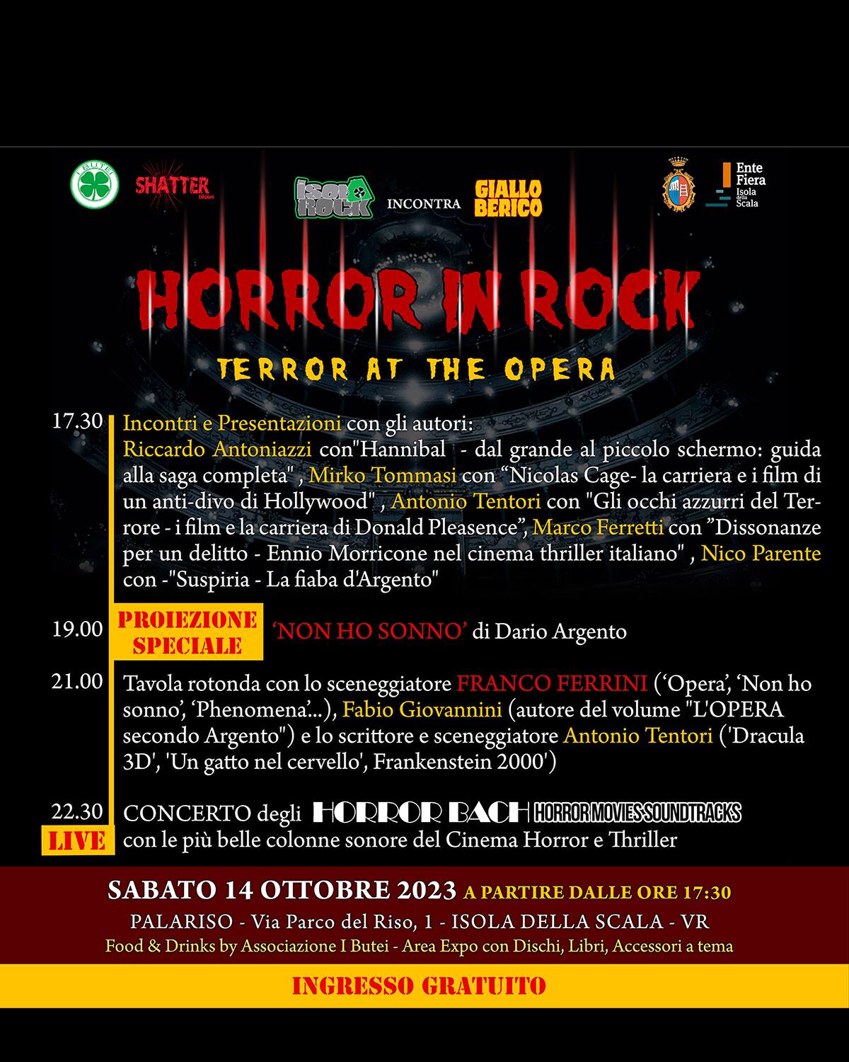 L’evento, dal sottotitolo 𝑻𝒆𝒓𝒓𝒐𝒓 𝒂𝒕 𝒕𝒉𝒆 𝑶𝒑𝒆𝒓𝒂, avrà luogo il 14 ottobre a Isola della Scala (Palariso – via Parco del Riso, 1) e sarà a ingresso gratuito. Il sipario si alzerà alle 17.00 dando spazio alle presentazioni dei libri targati SHATTER “Hannibal dal grande al piccolo schermo: guida alla saga completa” di Riccardo Antoniazzi, “Nicolas Cage – la carriera e i film di un anti-divo” di Mirko Tommasi, “Gli occhi azzurri del terrore- i film e la carriera di Donald Pleasence” di Fabio Giovannini e Antonio Tentori, “Dissonanze per un delitto – Ennio Morricone nel cinema thriller italiano” di Marco Ferretti e “Suspiria – la fiaba d’Argento” di Nico Parente.