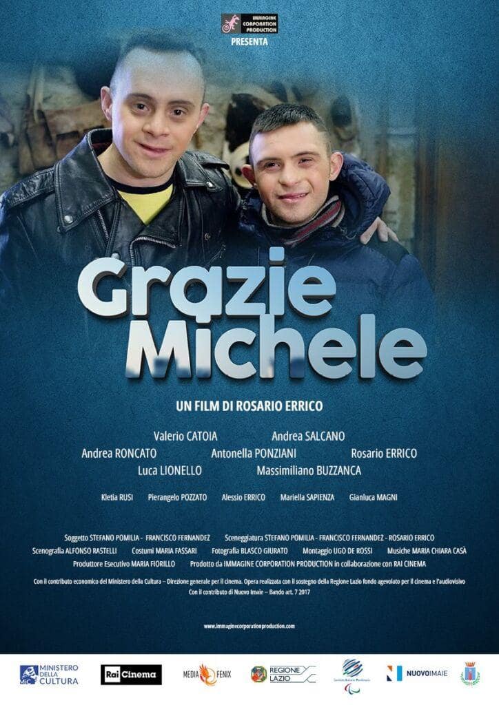 Qualificato per le nomination agli Oscar, Grazie Michele ha come protagonista Valerio Catoia, affetto da sindrome di down, nuotatore delle Fiamme Gialle nominato Alfiere della Repubblica a nome del Presidente Sergio Mattarella per aver salvato una ragazza che stava annegando in mare e poliziotto onorario dal Capo della Polizia Dott. Lamberto Giannini. Anche il co-protagonista, l'attore e ballerino Andrea Salcone, soffre della sindrome di Down. Inoltre, il cast è composto da: Andrea Roncato, Antonella Ponziani (ultima musa di Federico Fellini), Luca Lionello, Massimiliano Buzzanca, Alessio Errico, Kletia Rusi.
