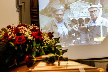Nella foto, il figlio Ermanno Taviani durante la cerimonia laica per il regista Paolo Taviani, scomparso in una clinica romana, dopo una breve malattia, circondato dai suoi cari all'età di 92 anni