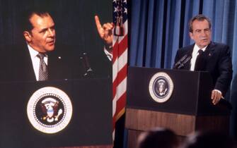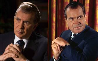 Frost/Nixon - Il duello (Frost/Nixon) è un film del 2008 diretto da Ron Howard, adattamento cinematografico delle vere interviste a Nixon registrate nel 1977 dal giornalista britannico David Frost e dell'omonimo dramma teatrale scritto da Peter Morgan, che cura anche la sceneggiatura del film, in cui è interpretare il Richard Nixon (a destra) c'è l'attore Frank Langella (a sinistra)
