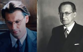 Fabrizio Gifuni (a sinistra) ha interpretato Alcide De Gasperi (a destra) in De Gasperi - L'uomo della speranza di Liliana Cavani. Si tratta di una miniserie ma è composta da sole due puntate, quindi da molti percepita come un film. Ripercorre la vita di Alcide De Gasperi, presidente del consiglio italiano dal 1945 al 1953