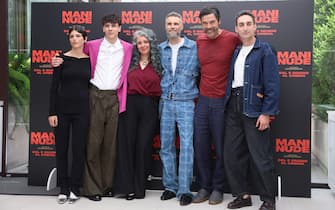 Il cast e i realizzatori di Mani Nude a Milano al photocall del film. Da sinistra: gli attori Giordana Marengo e Francesco Gheghi, la scrittrice Paola Barbato, il regista Mancini e gli attori Alessandro Gassmann e Paolo Madonna