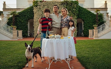 Nella foto, rilasciata in esclusiva da Propaganda Italia che trovate in testa all' articolo e realizzata da Andrea Miconi, vediamo una scena apparentemente serena: una famiglia in posa davanti a una villa sontuosa ricoperta di gelsomino, tavolo imbandito, bicchieri colmi, un cane al guinzaglio, sorrisi in controluce. Ma è proprio in quella perfezione disturbante, nella geometria elegante e nel filtro dorato, che si insinua il sospetto. Jasmine Trinca e Adriano Giannini abbracciano i due bambini con una tenerezza che ha qualcosa di posticcio, di recitato. Come se il male fosse già seduto a tavola, pronto a banchettare con loro.