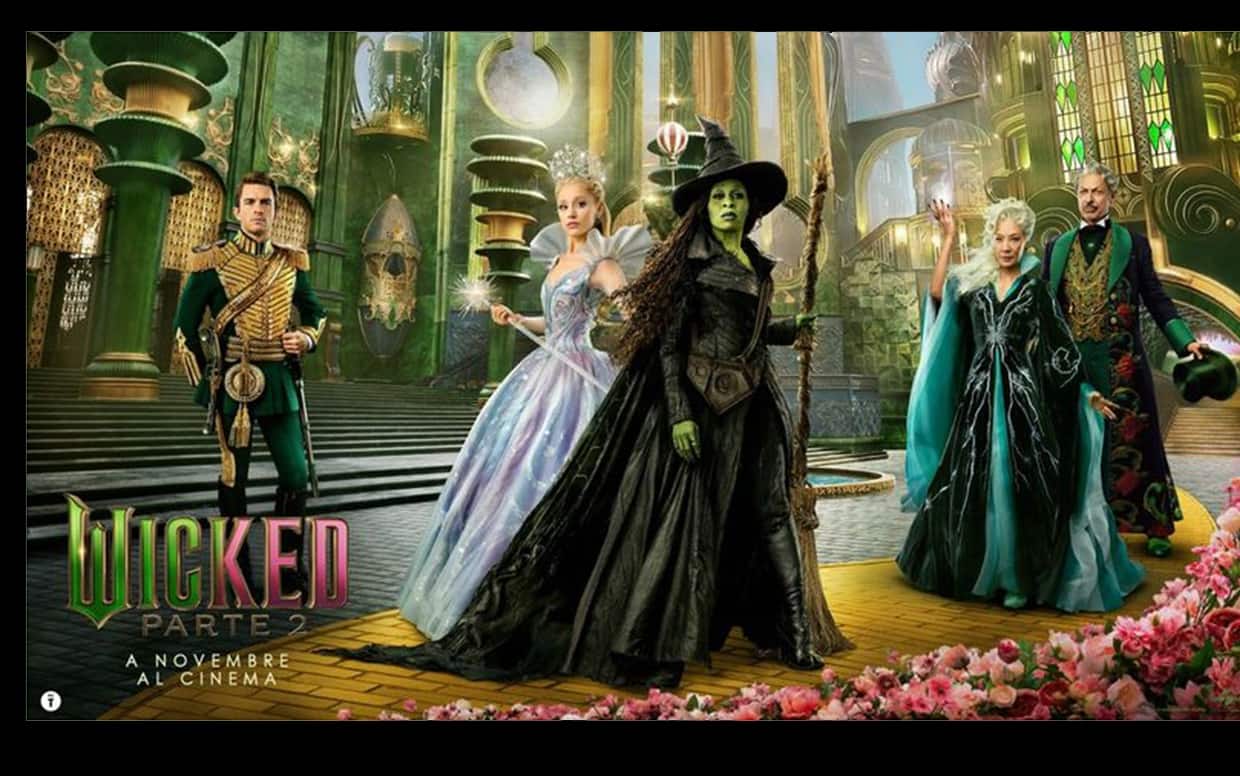 Il nuovo poster ufficiale, coloratissimo e sontuoso, ci mostra l’intero ensemble: Elphaba al centro, Glinda fasciata in abiti da favola, il Mago e Madame Morrible pronti alla manipolazione, Fiyero elegante e ambiguo. Tutto immerso nelle vertiginose architetture smeraldine che rendono Oz un regno visivo unico. La palette cromatica, tra verde, oro e rosa, promette un’estetica barocca e teatrale degna della saga.