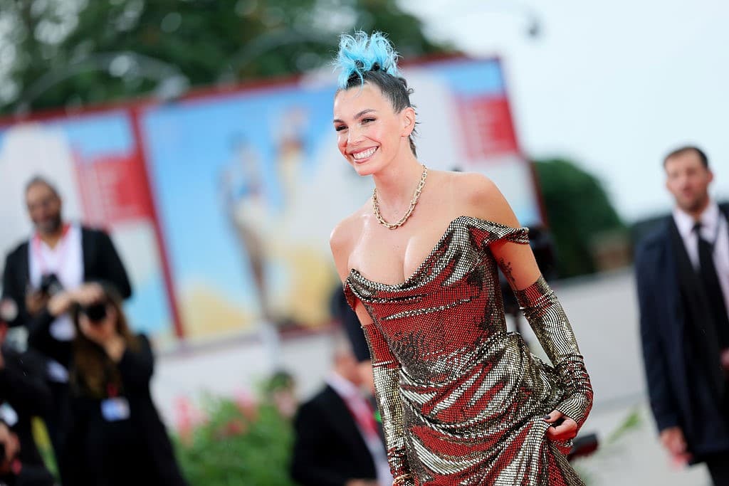 Alla serata inaugurale della Mostra del Cinema di Venezia 2025, la cantante e artista Rose Villain ha catalizzato l’attenzione con un look che ha saputo fondere couture e ribellione punk, diventando uno dei momenti più discussi e fotografati del red carpet della giornata inaugurale. Rose ha indossato un abito da sposa metallizzato firmato Vivienne Westwood, realizzato in georgette ricoperta di paillettes dorate, con un corsetto strutturato, gonna a sirena e guanti lunghi coordinati. Il vero colpo di scena è stato l’hair look: una cresta punk blu, volutamente in contrasto con l’eleganza dell’abito. Non si trattava di un taglio permanente, ma di un’acconciatura costruita ad hoc, con i capelli tirati verso l’alto per creare un effetto “messy” e ribelle. A completare il look, gioielli Tiffany & Co. delle linee più audaci, come HardWear e Titan (firmata da Pharrell Williams), che hanno aggiunto un tocco urban e musicale all’insieme.