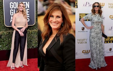 Una variante di uno degli stili più amati da Julia Roberts: il look coi pantaloni da sera sormontati da una sopragonna a strascico. In foto, il look virale per i Golden Globes del 2019, col top monospala in tulle di Stella McCartney. Un vero sogno