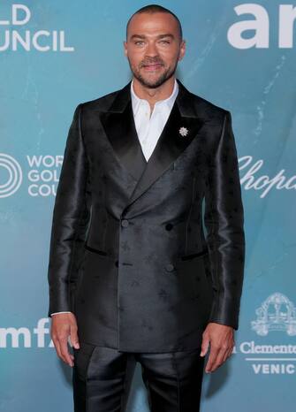 Abito da sera doppiopetto lucido e gioielli di Chopard. Jesse Williams, che aveva già sfilato al Lido alla Mostra del Cinema, riappare tra gli ospiti del prestigioso amfAR Gala