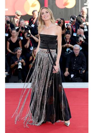 Emanuela Fanelli punta sullo scintillio per la serata che chiude ufficialmente la 82esima Mostra del Cinema di Venezia 2025. L'attrice, attesa sul palco della cerimonia di consegna dei premi, punta sull'eleganza serale e contemporanea ed è glamour con completo col top senza spalline e la gonna larga con motivo jacquard oro, abbellita da un sopragonna di frange di strass. Il make-up naturale è firmato Armani Beauty. L'hairstyle morbido è di Kerastase. Voto: 8.5