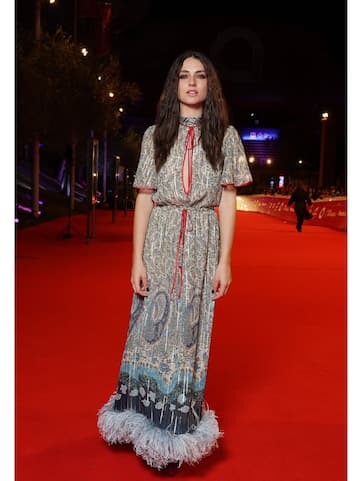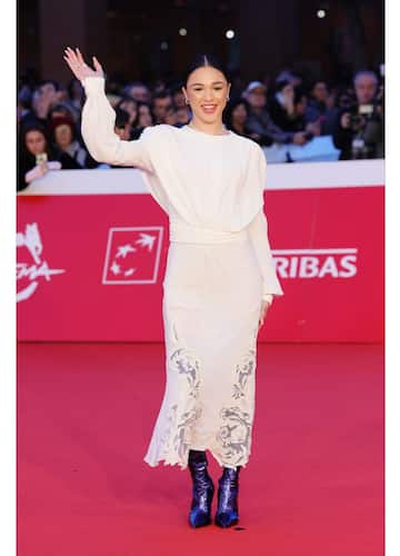 Maria Esposito saluta i fan assiepati dietro le transenne del tappeto rosso della Festa del Cinema Roma. L'attrice nata a Napoli è la protagonista di Io sono Rosa Ricci, lungomentraggio firmato da Lydia Patitucci che arriverà nelle sale dal 30 ottobre. Il film è uno spin-off di Mare Fuori, la serie televisiva che ha dato la popolarità alla star ventunenne che è arrivata in abito midi bianco caratterizzato da drappeggi e inseti di merletto, una creazione indossata con stivali viola intenso.