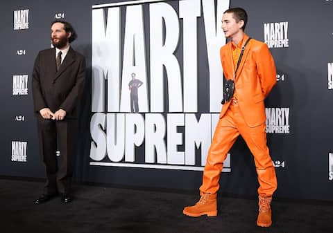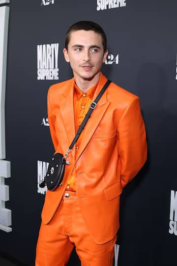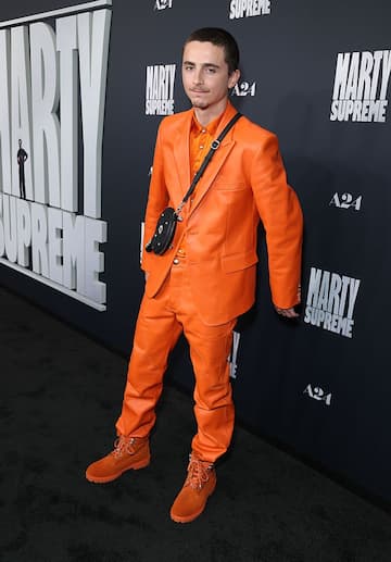 Timothée Chalamet, dal canto suo, ha scelto un completo arancione e ha portato con sé una custodia nera da racchetta da ping-pong indossata sul petto, un richiamo diretto al suo personaggio in Marty Supreme.