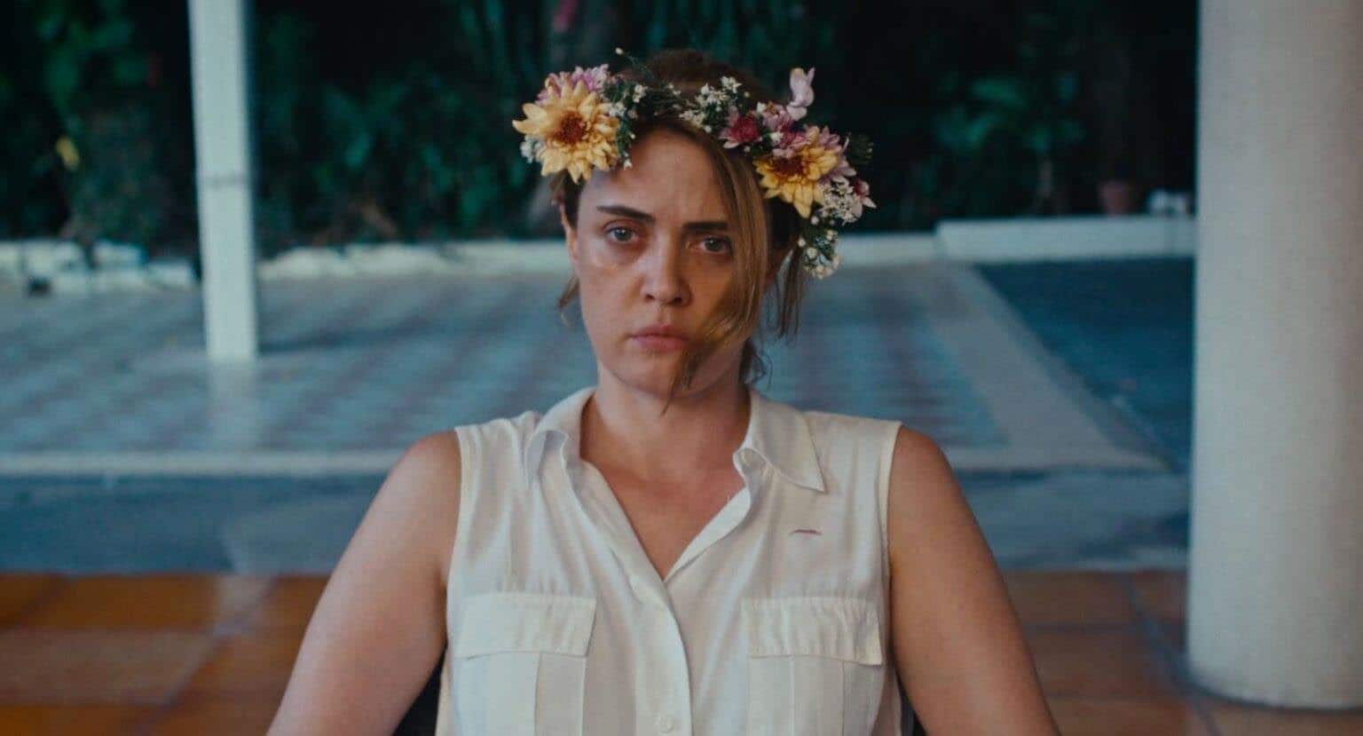 In una delle sequenze più riuscite indossa una corona di fiori, il blomsterkrans, che richiama l'immaginario disturbante di Midsommar. di Ari Aster .Non è una citazione casuale. È un'immagine che lavora, che resta.