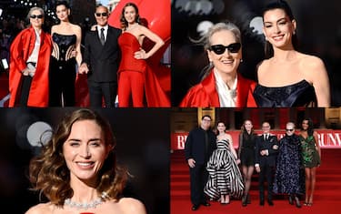Anche Emily Blunt opta per il total red e il suo look coi pantaloni e il top bustier con la coda è una creazione esclusiva di Balenciaga. La star britannica posa con Donatella Versace, avvistata sul set del film lo scorso ottobre e in nero per l'occasione, dress con top plissettato e gonna lunga svasata.
