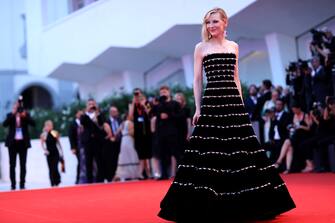 Cate Blanchett con un abito nero arricchito di dettagli in perle di Armani Privé sul red carpet del film “Joker”.