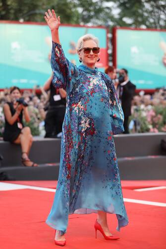 Meryl Streep con un abito in seta a stampa floreale di Givenchy sul red carpet del film "The Laundromat”.
