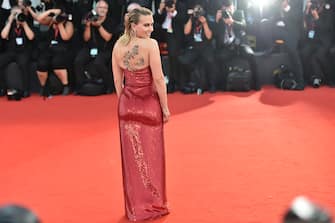 Scarlett Johansson con un abito a sirena rosso fuoco firmato Celine che le lascia la schiena nuda (e il tatuaggio in bella vista). Il red carpet è quello del film “Mariane Story”.