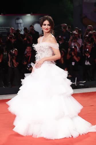 Penelope Cruz con un abito a balze in bianco firmato Ralph & Russo Couture e con gioielli di Atelier Swarovski per il red carpet di "Wasp Network”.