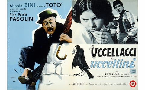 Uccellacci e uccellini (1966) – Totò e Ninetto Davoli interpretano padre e figlio che incontrano un corvo parlante. Tra aneddoti e favole, questa pellicola ironica, poetica e surreale diventa una riflessione su problemi come la crisi culturale della sinistra comunista negli anni '60, le contraddizioni della società dell’epoca, il ruolo dell’intellettuale, il destino del proletariato. Colonna sonora di Morricone, canzoni dei titoli di testa e di coda interpretate da Modugno. Menzione speciale a Totò al Festival di Cannes, 2 Nastri d’argento. Insuccesso commerciale