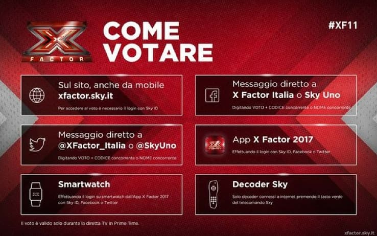 Proprio così: sono innumerevoli i voti che arrivano al programma attraverso i social network. Le possibilità di voto di quest’anno? Su Twitter, potrete esprimere la vostra preferenza tramite Messaggio Diretto agli account ufficiali di X Factor e Sky Uno con questa modalità: dovete digitare la parola “VOTO” seguita dal nome del concorrente e dal suo codice di riferimento, che il frizzante conduttore vi ricorderà a ogni manche. Una piccola attenzione: per poter votare in questo modo, sarà necessario autenticare il proprio account inviando un messaggio al numero 342.4112667. La novità di quest’anno? Esattamente come sul social dagli ermetici cinguettii, potrete votare il vostro cantante del cuore anche su Facebook attraverso Messenger. Anche qui, gli account di riferimento sono quelli ufficiali del talent e del canale di Sky di riferimento. Non vi bastano queste modalità? Ecco l’APP XF 2017: scaricatela sul vostro Smartphone (o anche su Smartwatch o Tablet), autenticatevi con l’ID di Sky o con i vostri account social di Fb e Tw e votate! I concorrenti, i giudici e un super carico Alessandro Cattelan vi aspettano questa sera, alle 21.15, su Sky Uno: buon primo Live a tutti!