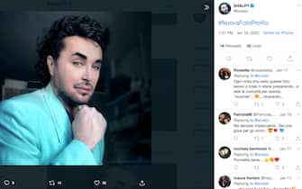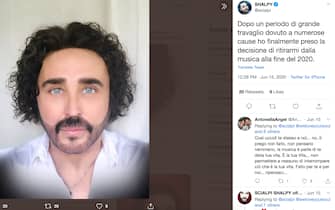 Shalpy con giacca turchese e capelli leggermente ricci. La foto è stata pubblicata su Twitter dal cantante.