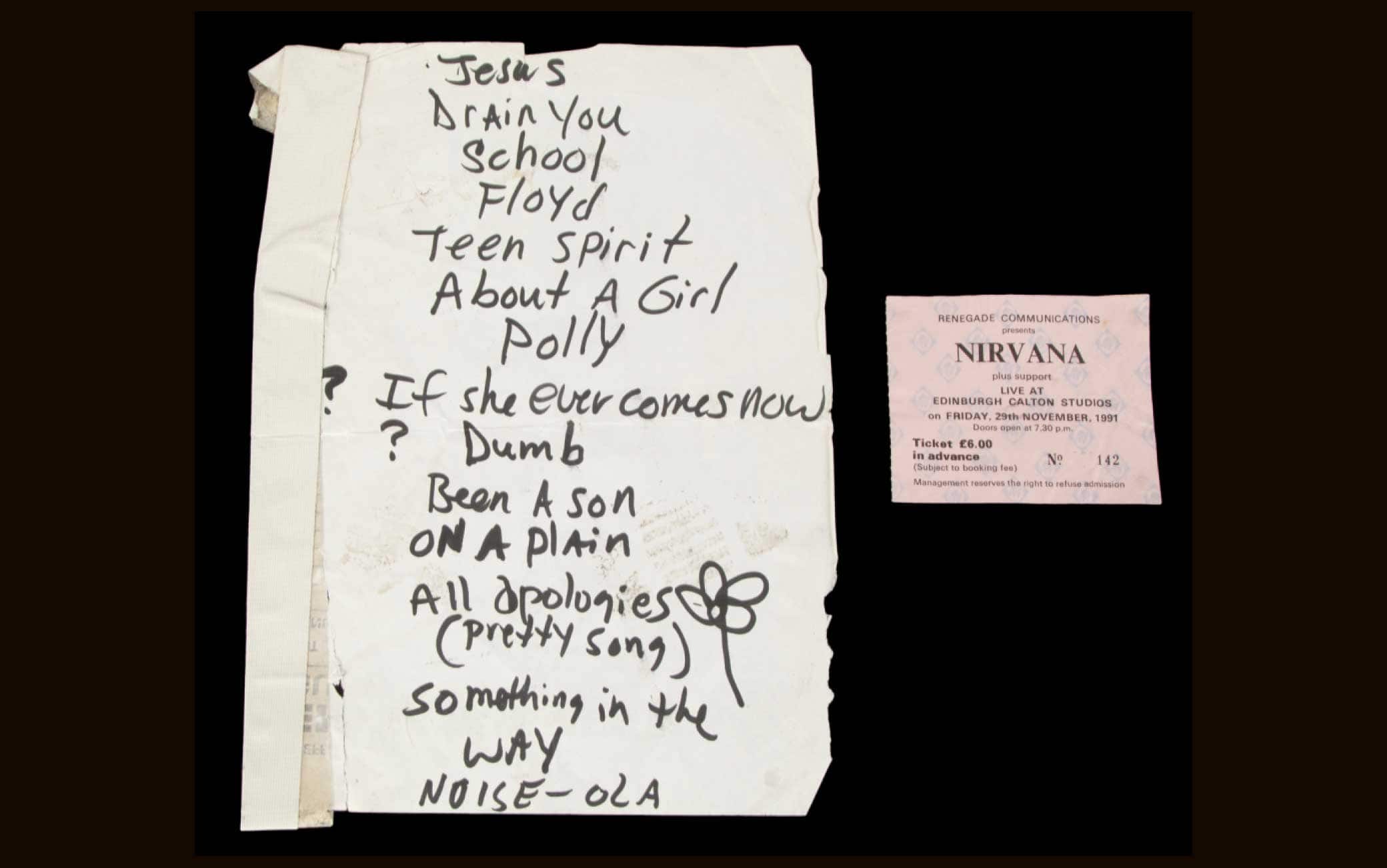 Tra gli oggetti all'asta, apparteneva a Cobain anche un altro dei pezzi forti: una scaletta scritta a mano delle famose canzoni "Come As You Are" e "About A Girl" del leader dei Nirvana, che morì nel 1994 all'età di 27 anni.