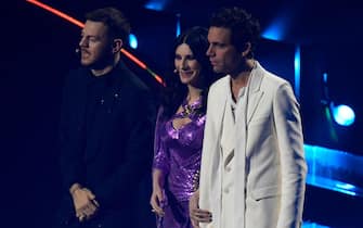 Finale scintillante per i tre presentatori. Anche Mika e Alessandro Cattelan si concedono outfit pieni di luce ma con stili differenti: completo paillettes per il primo, motivo gessato e papillon per il secondo