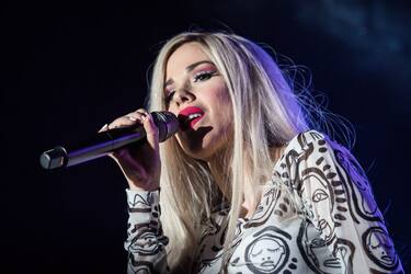Baby K sul palco insieme alla collega Giusy Ferreri durante la finale di X Factor 10 al Mediolanum Forum di Assago di Milano